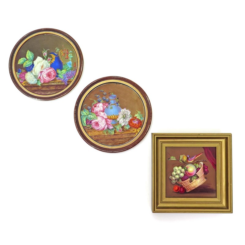 A pair of porcelain circular plaques 19th century, painted with ewers amidst large rose, lilac and dahlia flowers, resting on decorative table tops, and an English porcelain square plaque painted with a colourful bird alighted on a fruiting branch on a tilted basket filled with grapes and other fruits, in a later giltwood frame, 13.3cm max. (3)