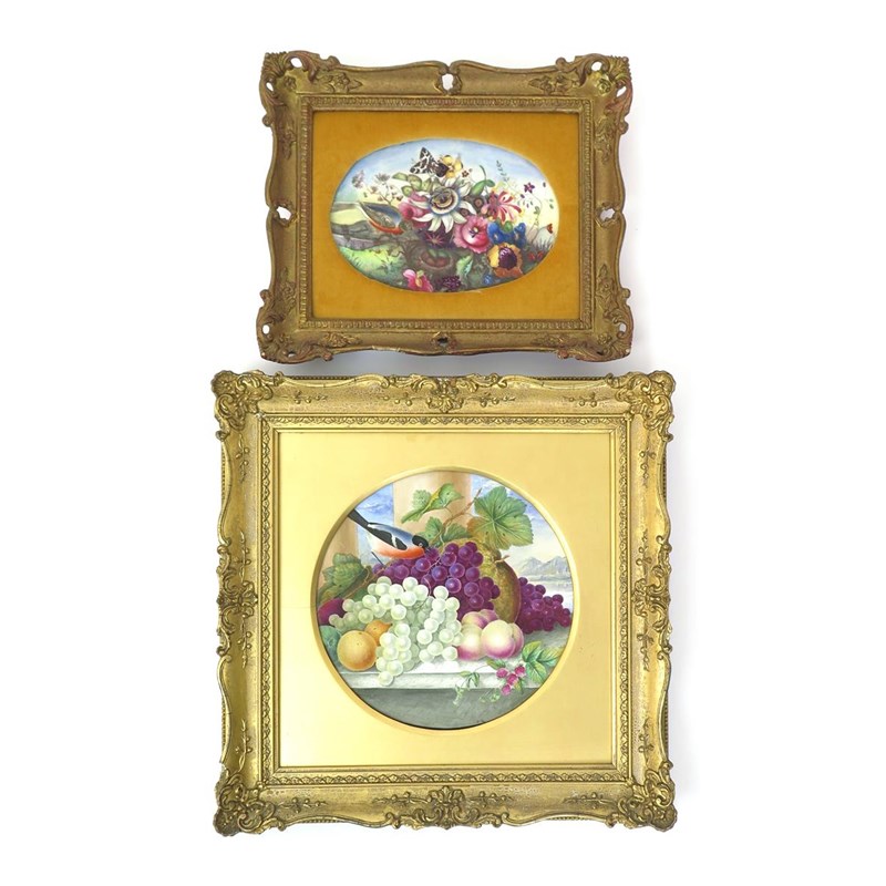 Two English porcelain plaques 19th century, one perhaps Derby, painted with a bullfinch perched above a nest of eggs beneath a bold arrangement of flowers, signed to the reverse 'J.B. March 24th 1825', the other painted with a bullfinch perched on a stem of fruiting grapevine above other fruits including raspberries and peaches on a marble ledge, some restoration to the former, 39cm overall max. (2)
