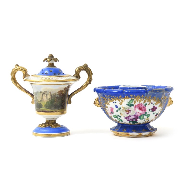 A Doe and Rogers (Worcester) vase and cover c.1830, painted with a view of Eastnor Castle reserved on a blue ground, the domed cover pierced with small holes, and a Paris porcelain inkwell painted with floral panels on a similar blue ground, some faults, 11.7cm max. (3)