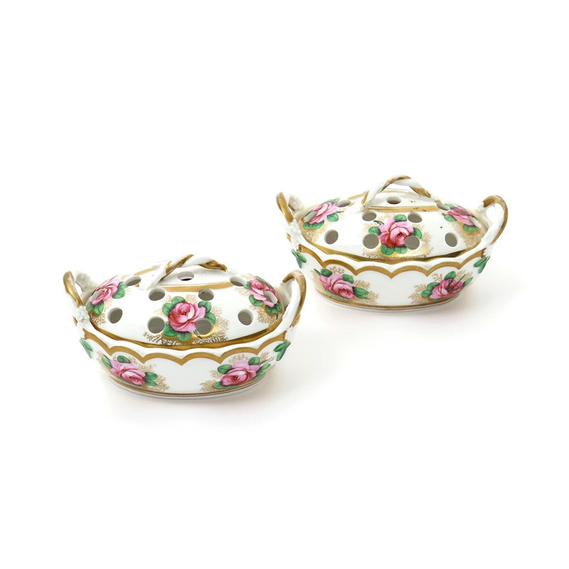 A pair of Spode violeteers and covers c.1810, the shallow oval forms painted in pattern 2812 with pink roses amidst gilt tendrils, the slightly domed covers pierced with an arrangement of small holes beneath the ropetwist handles, iron red marks and pattern numbers, a base crack to one, 10.5cm across. (4)
