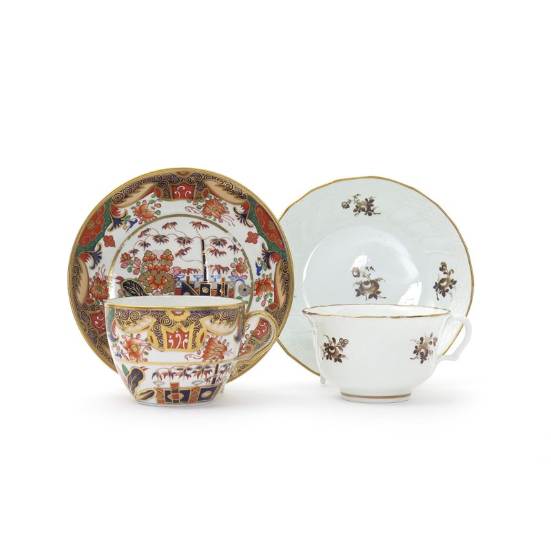 A Spode cup and saucer c.1820-30, richly decorated in pattern 967 with an Oriental landscape in the Imari palette, and a Swansea cup and saucer painted with sepia flower sprays, 14cm max. (4)