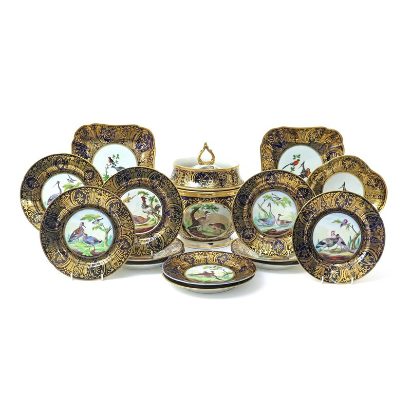 A Coalport ornithological part dessert service c.1815, probably decorated in London with various scenes of garden, game and aquatic birds reserved within wide gilt foliate borders on a rich blue ground. Comprising: an ice pail with liner and cover, two square dishes, a shell-shaped dish, and eleven plates. (17)