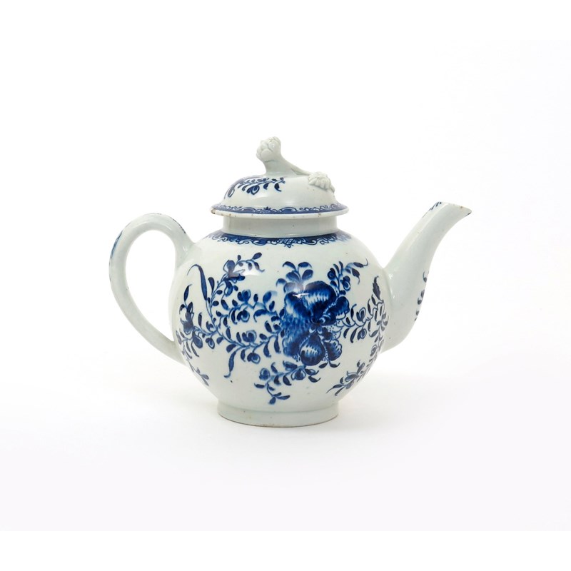 A Lowestoft blue and white teapot and cover c.1780, the globular body painted with the Mansfield pattern, the cover with a floral finial, open crescent mark, a rim crack, 19.5cm. (2)