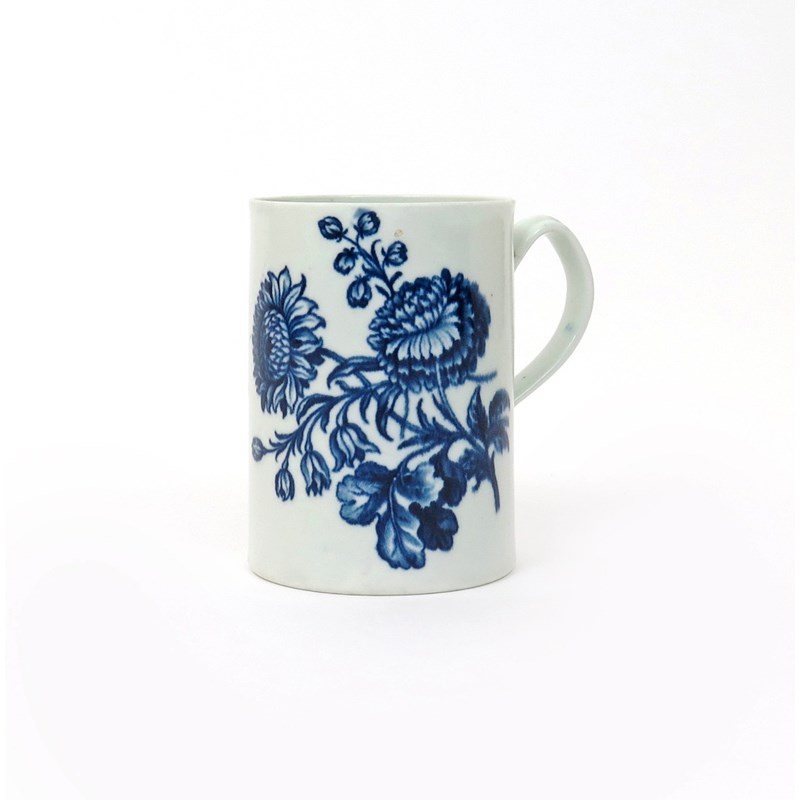 A Worcester blue and white mug c.1765-70, the cylindrical body printed with the Natural Sprays group, of large chrysanthemum blooms and a spray of rose, hatched crescent mark, 11.8cm.