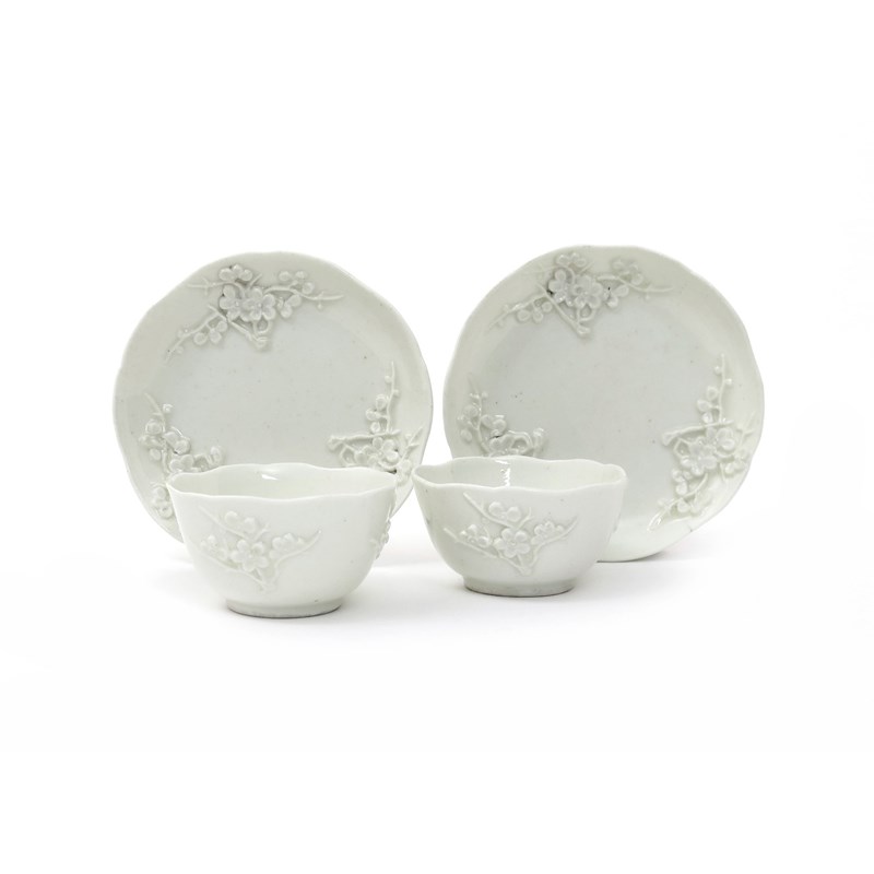 A pair of Bow white-glazed teabowls and saucers c.1755-58, with shaped rims, each applied with three sprigs of flowering prunus, a short crack to one saucer, 11.4cm. (4)