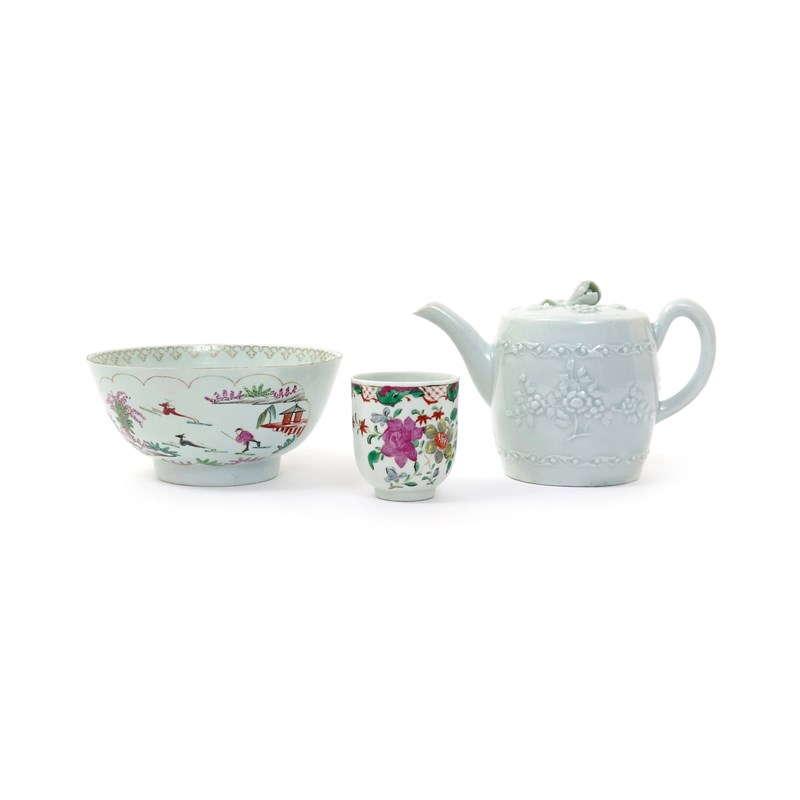 A Worcester moulded teapot and cover c.1770, the barrel form moulded with flower sprays within continuous foliate bands, left in the white, a Worcester coffee cup with polychrome flower decoration, and a slop bowl painted with the Stag Hunt pattern, some restoration to the bowl, 18cm max. (4)