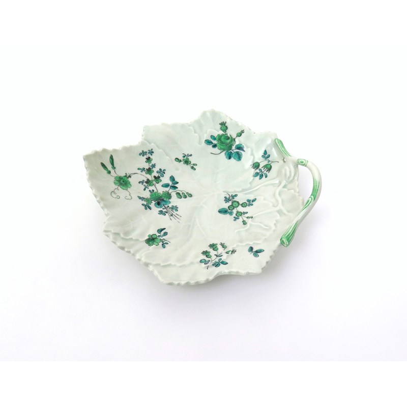 A Worcester leaf dish c.1770, formed as two overlapping vine leaves with a stalk handle, painted in the atelier of James Giles with sprays of flowers in green monochrome, 22.3cm.