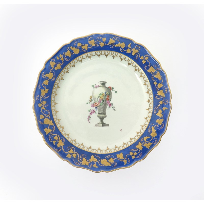 A Worcester dessert plate c.1770-75, painted in the atelier of James Giles with a central stone urn draped in flowers, the rim with a continuous band of gilded grapevine on a rich blue ground, 22.6cm.