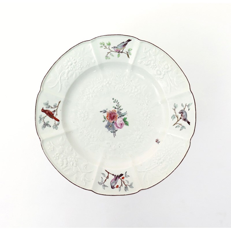 A Chelsea plate c.1756, moulded after Meissen in the Gotzkowsky manner, the well painted with a small posy of flowers, the rim with four vignettes of birds perched on branches, brown line rim, 23.5cm.