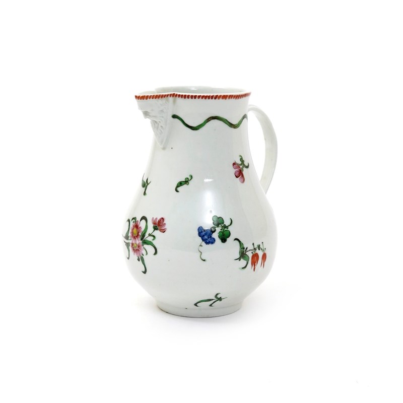 A Bristol mask jug c.1775, painted in polychrome enamels with sparse scattered floral sprays, a wavy band of green ribbon beneath a red dash border to the neck, the spout finely modelled with the face of a bearded man, minor faults, 17cm.
