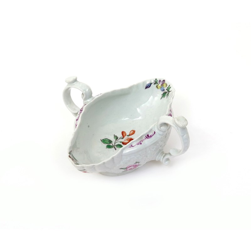 A good Worcester two-handled sauceboat c.1758, moulded to the exterior with four floral panels containing single polychrome flower stems, echoed to both sides of the shell spouts, the interior with a larger spray, above the handles with puce scroll detailing, 18.8cm.