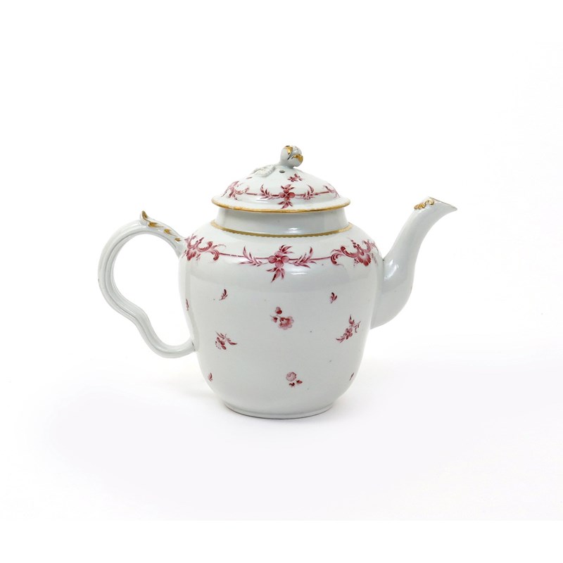 A large Bristol teapot and cover c.1775, the inverted pear-shaped body painted in puce monochrome with scattered single flowers, the shoulder with a border of C scrolls, shells and floral motifs echoed to the cover, blue crossed swords mark and gilt 6, 22cm. (2)