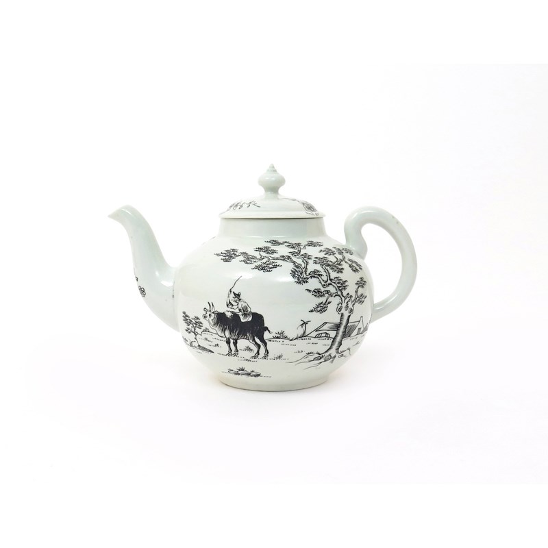 A Worcester teapot and cover c.1755-57, of slightly compressed globular shape, pencilled in black with the Boy on a Buffalo pattern, the youngster astride his placid bovine mount, the reverse with a bird in flight above another buffalo and two sampans, incised mark to the base, a small chip to the cover, 19cm. (2)