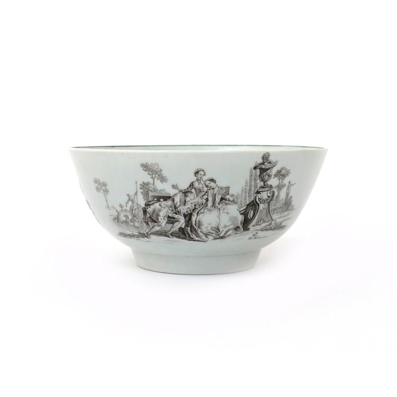 A Worcester slop bowl c.1765, printed in black with L'Amour to one side, the reverse with Rural Gambols, between small vignettes of Classical ruins, the interior with swans on the water, L'Amour signed R H Worcester in the print for Robert Hancock, and with an anchor rebus for Richard Holdship, some good restoration, 15.5cm.