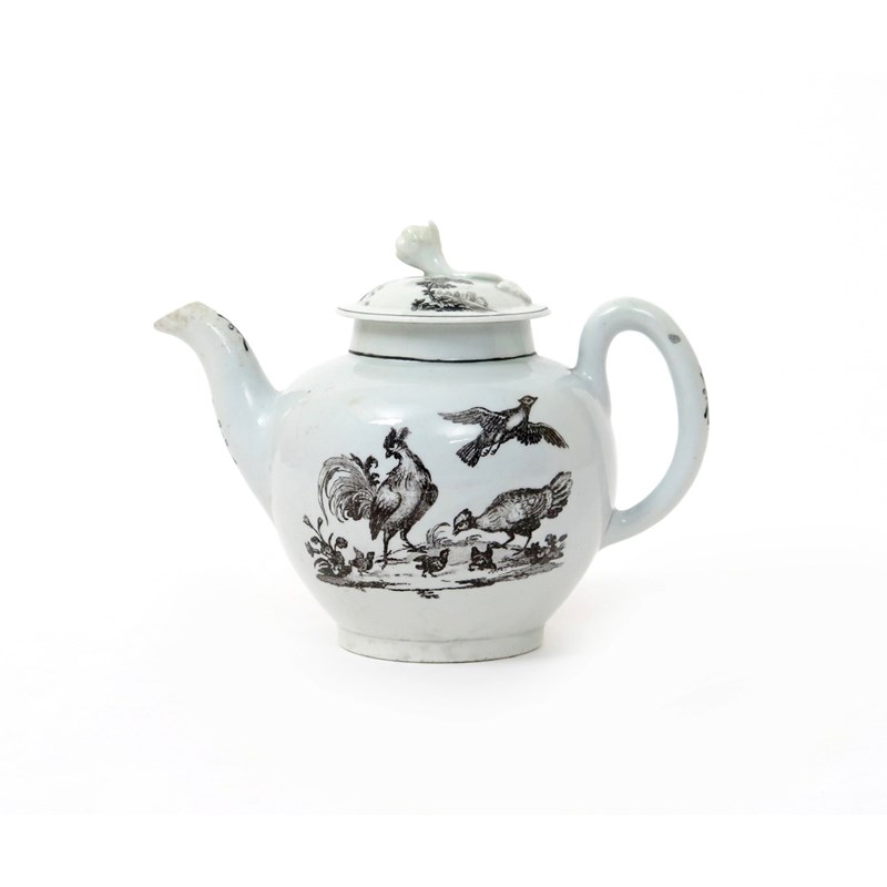 A Worcester teapot and cover c.1758-60, printed in black with a cockerel, hen and chicks to one side, the reverse with a duck and other birds in flight above fancy birds perched on the ground, the cover with three landscape vignettes around the floral finial, 16cm. (2)