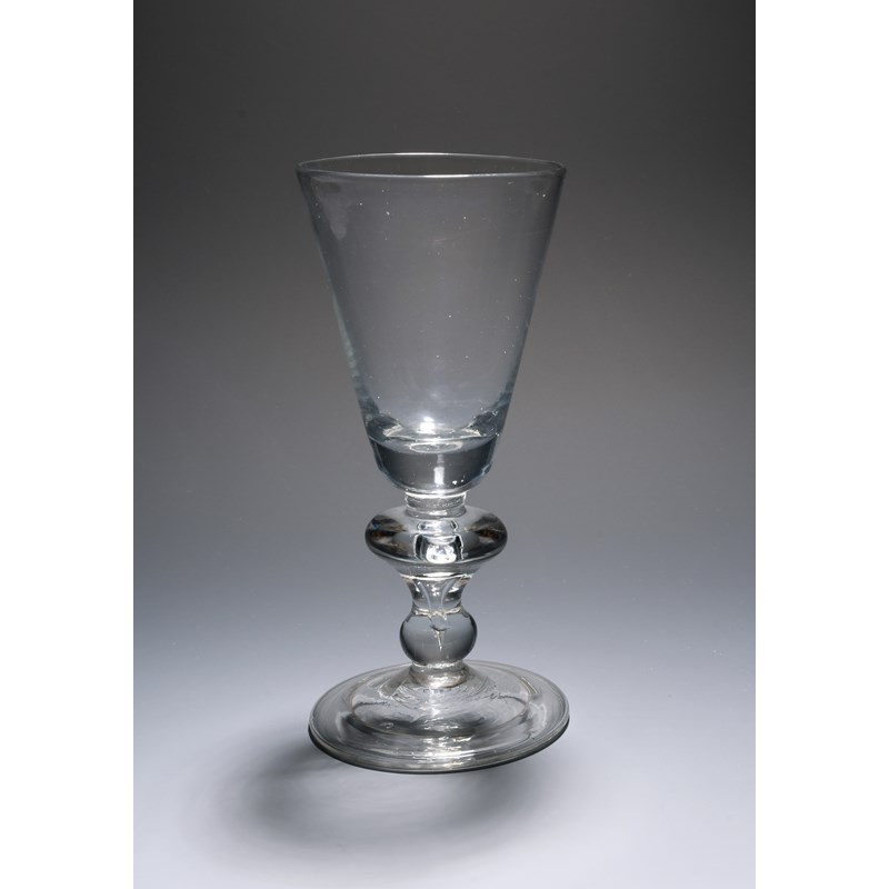 A large heavy baluster glass, c.1720, the generous round funnel bowl with a solid base, raised on an