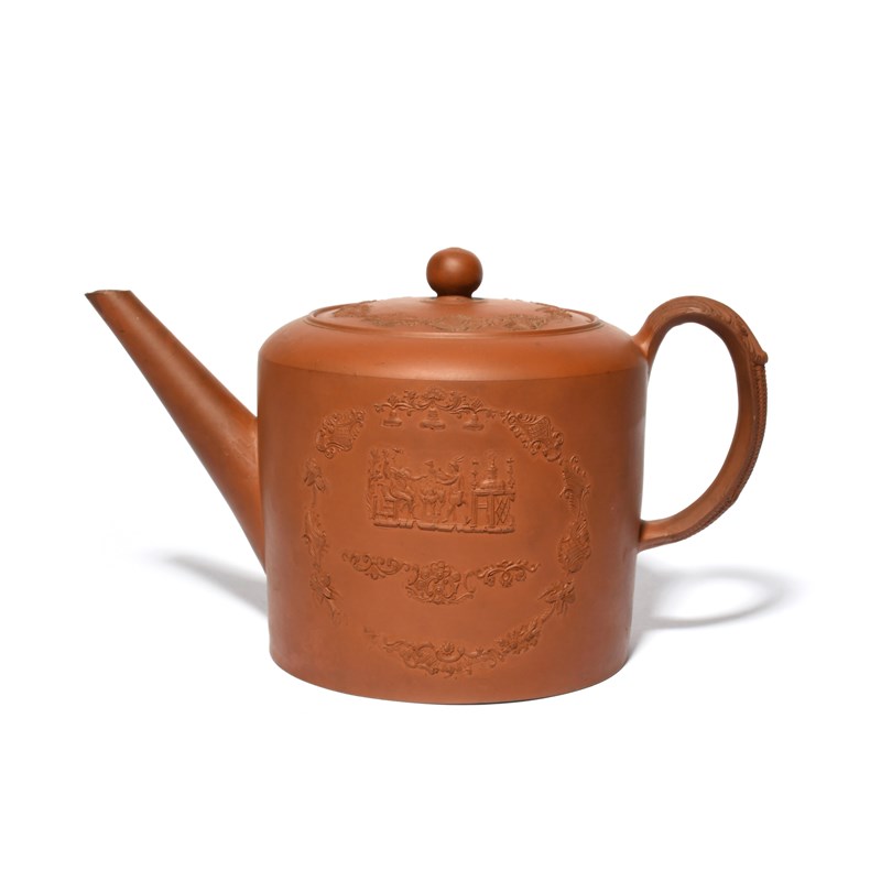 A large Staffordshire redware teapot or punch pot and cover, c.1760, the cylindrical form sprigged with figures at various pursuits with birds and objects, between formal foliate and trellis designs, some chipping to the edge of the cover and spout, 7.5cm across. (2)