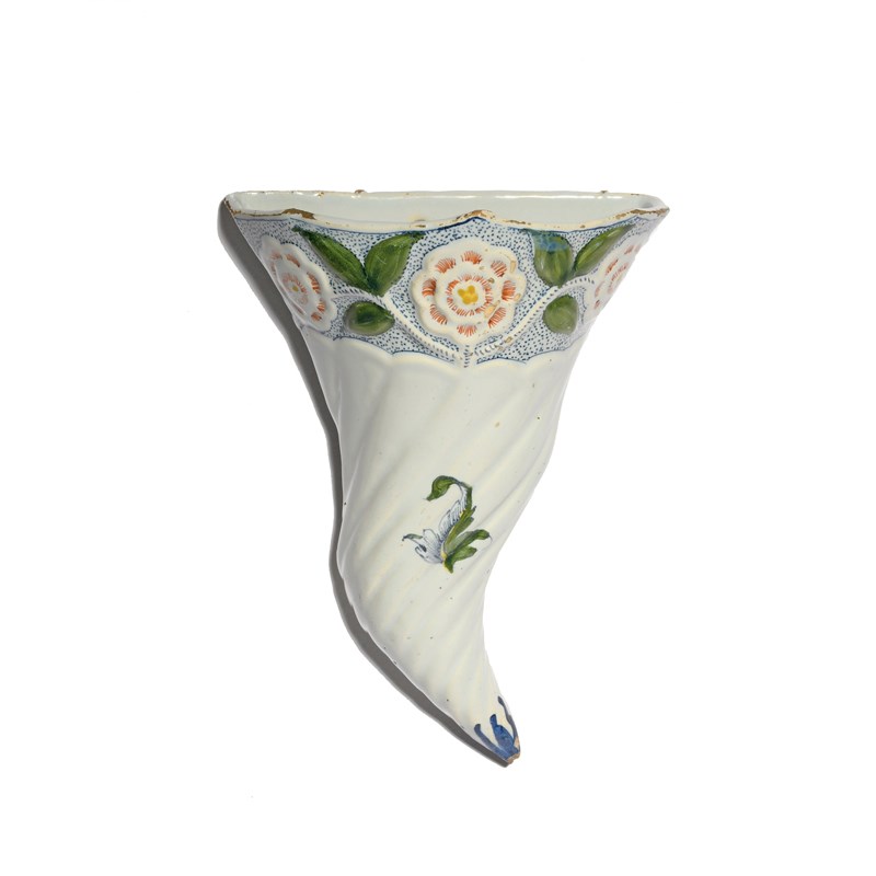 A delftware wall pocket, c.1760, of spiral-moulded cornucopia form, the rim moulded and painted with