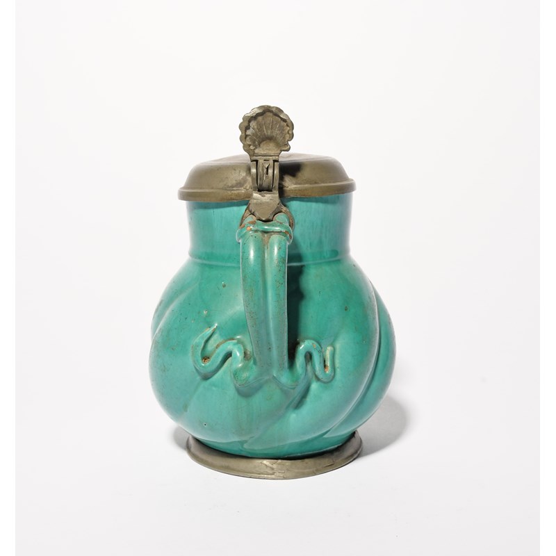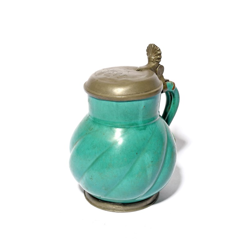 A German faïence jug, 18th century, the squat spiral-moulded body decorated in a rich turquoise glaze, with a pewter mount to the foot and a hinged pewter cover inscribed 'MR' and 'HSM', 16.8cm high.