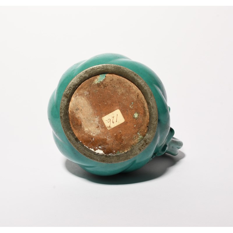 A German faïence jug, 18th century, the squat spiral-moulded body decorated in a rich turquoise