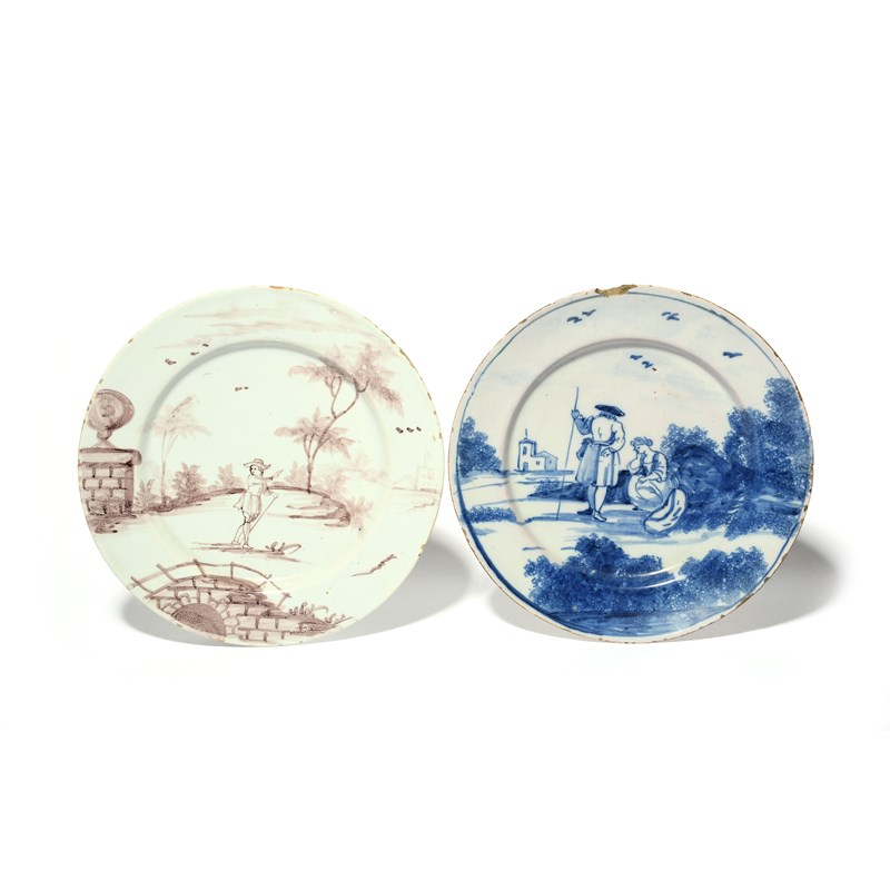 Two delftware plates, c.1760-80, one painted in blue with European travellers in a landscape, a man standing and looking down to his seated companion, the other painted in manganese with a solitary traveller beside trees and garden statuary, some chipping, 22.5cm max. (2)