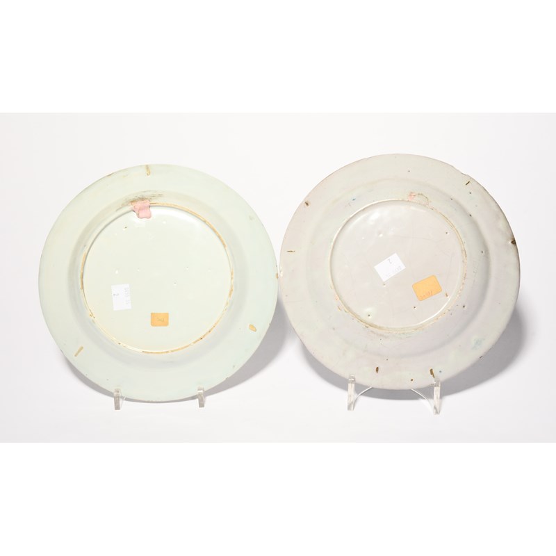 Two delftware plates, c.1760-80, one painted in blue with European travellers in a landscape, a man
