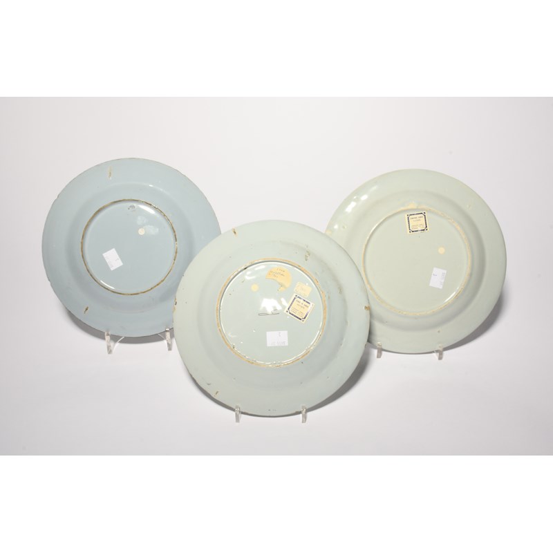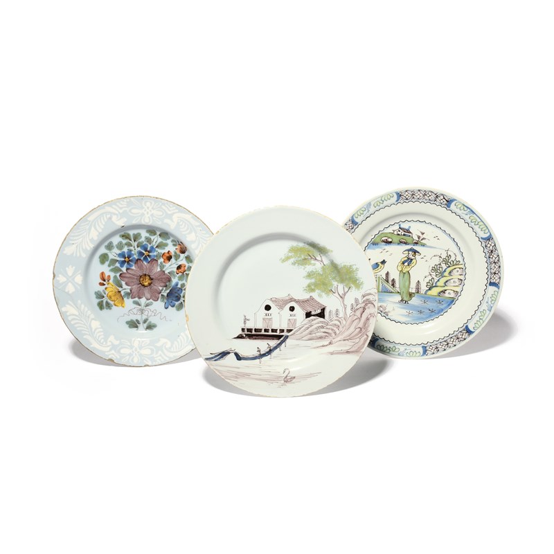 Three delftware plates, c.1750-70, one Bristol and painted in the Fazackerly palette with a flower arrangement within a bianco-sopra-bianco border, another Liverpool and painted with figures on a bridge before low huts on an island, the last painted with a lady in a wide hat looking at a large bird perched on a fence, within a panelled diaper border, 23.3cm max. (3)