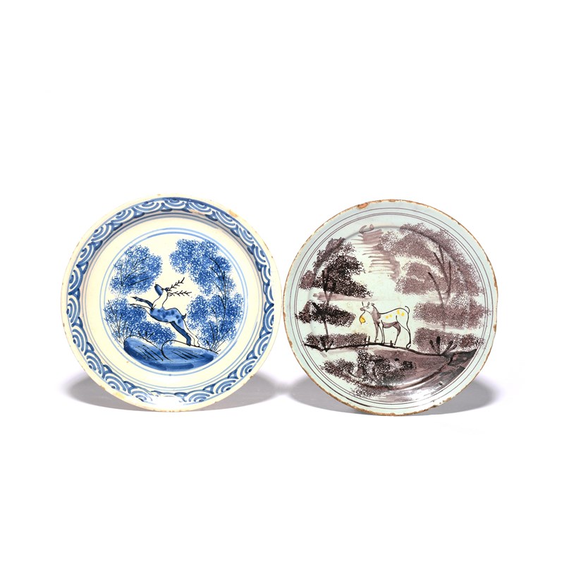 Two delftware plates, c.1720-40, probably London, one painted in manganese and yellow with a dog carrying a stick between tall sponged trees, the other in blue and black with a leaping stag beneath sponged trees within a scalloped blue border, some rim faults, 21.8cm max. (2)