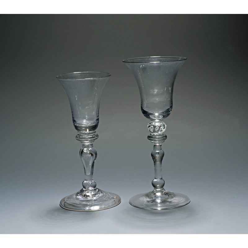 A light baluster wine glass, c.1740, the bell-shaped bowl raised on a composite baluster stem with a teared knop over collar rings and an inverted baluster section with basal knop, and another light baluster or balustroid glass with a bell bowl over a hollow baluster and basal knop above a folded foot, 17.5cm max. (2)