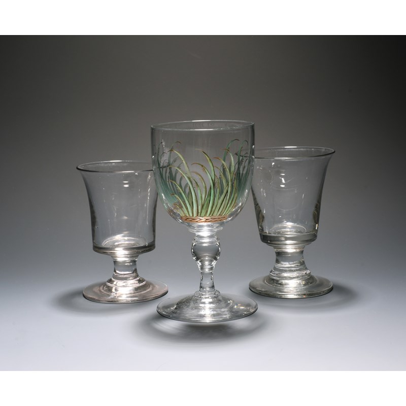 Two glass rummers, c.1800, with generous flared bucket bowls raised on short plain stems, and a Richardsons of Stourbridge vitrified enamel goblet, decorated with three bands of reeds, 16.7cm max. (3)