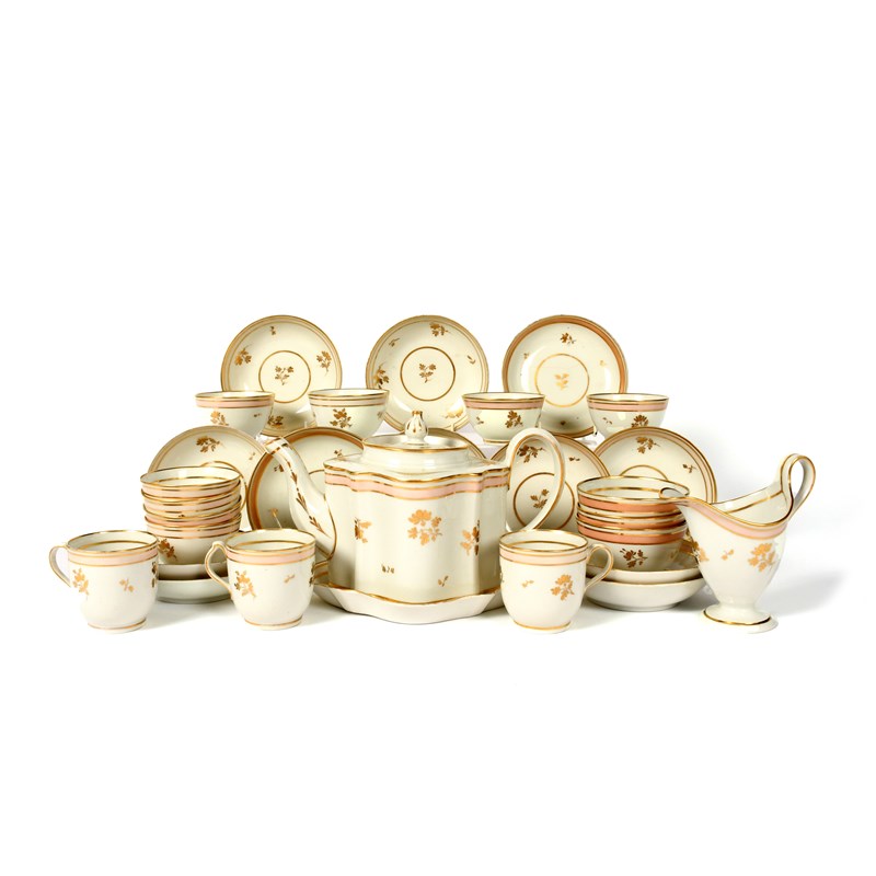 A New Hall part tea service, c.1800, decorated in pattern 167 with narrow pink bands above gilt flower sprigs. Comprising: a teapot with cover and stand, a milk jug, eleven teabowls, three coffee cups and twelve saucers. (30)