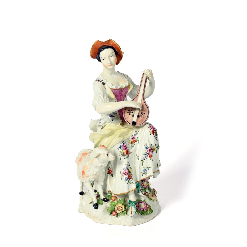 A large Derby figure of a musical shepherdess, c.1760, seated and playing the mandolin, a sheep standing beside her right knee, a chip to her jacket, the end of her instrument lacking, 28.5cm.