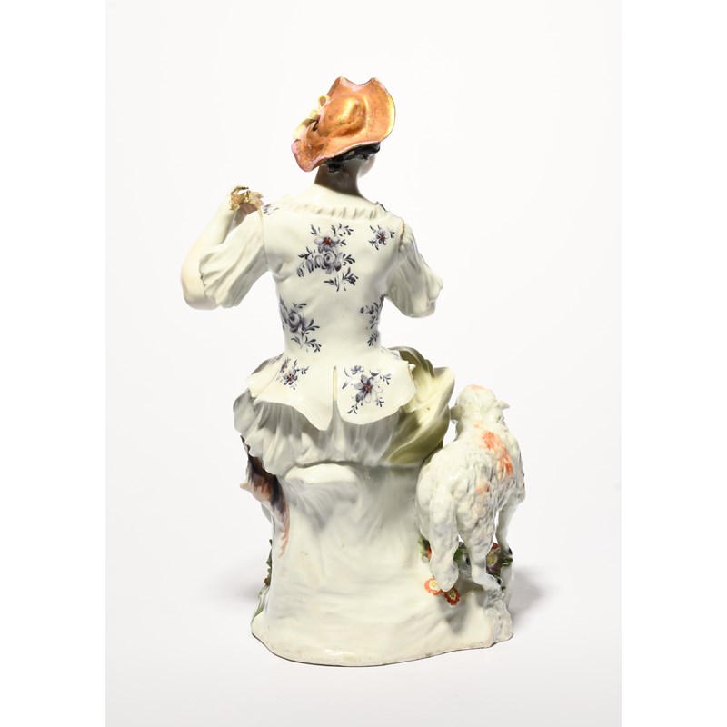A large Derby figure of a musical shepherdess, c.1760, seated and playing the mandolin, a sheep