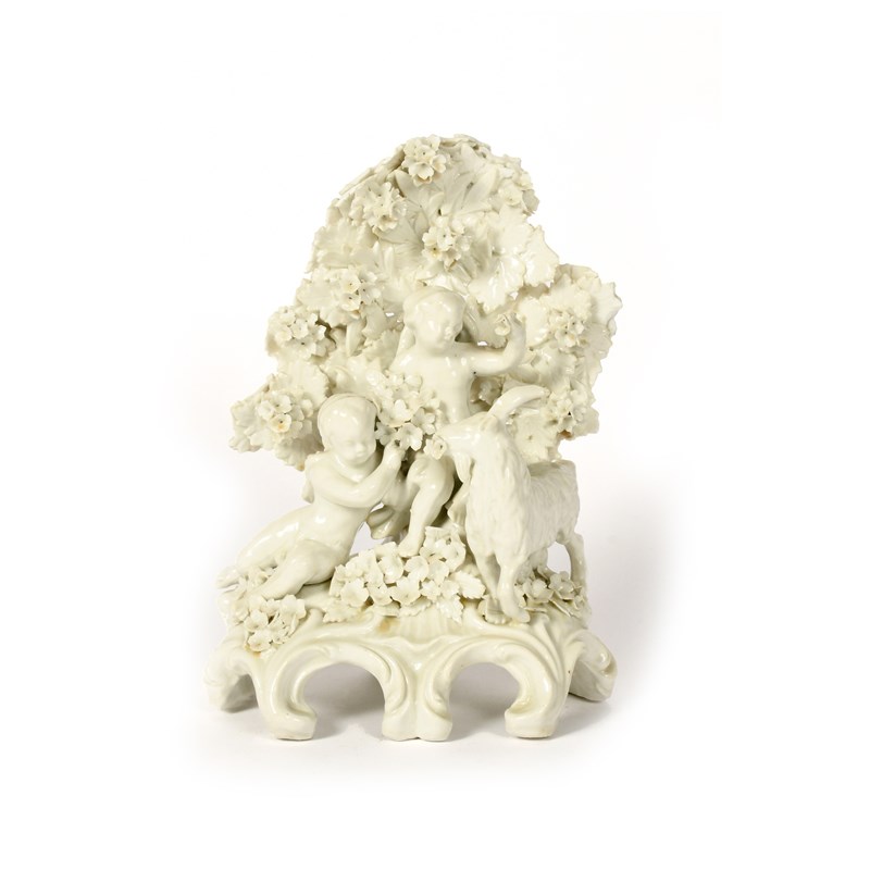 A Plymouth white-glazed figure group, c.1770, modelled with two putti and a goat raised on a tall scrolled base before flowering bocage, some chipping, 20.5cm.