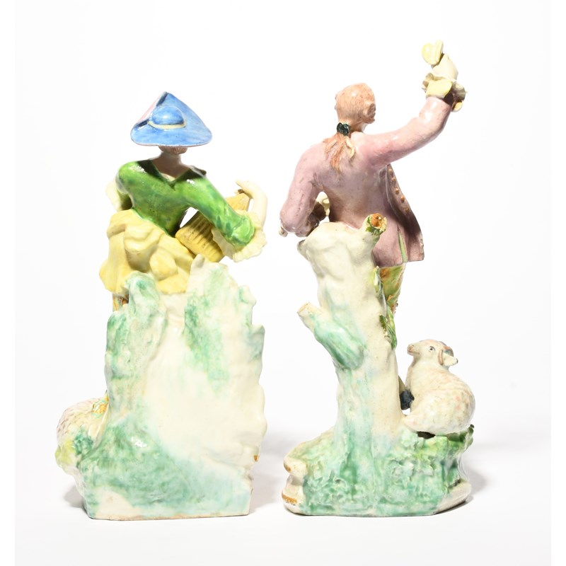 An early pair of Bow figures of Liberty and Matrimony c.1750-52, modelled as a gentleman holding a small bird aloft in his right hand, his companion holding a bird cage on one hip, each with a recumbent sheep beside them and raised on scrolled bases, some damages and restoration, probably later-decorated, 26cm. (2)