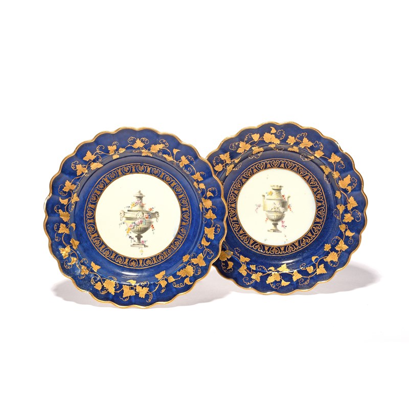 A pair of Worcester plates, c.1770, the wells painted with Classical vases or urns draped in flowers, reserved within wide wet blue borders with gilt grapevine bands, open crescent marks, 21.5cm. (2)
