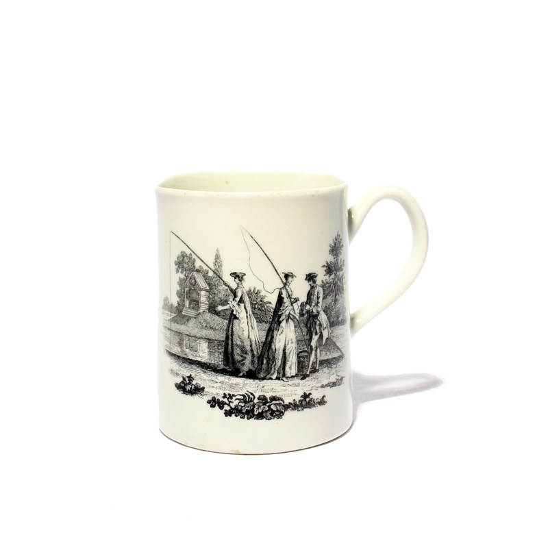 A small Worcester mug, c.1760, printed in black with the Whitton Anglers, the reverse with a milking