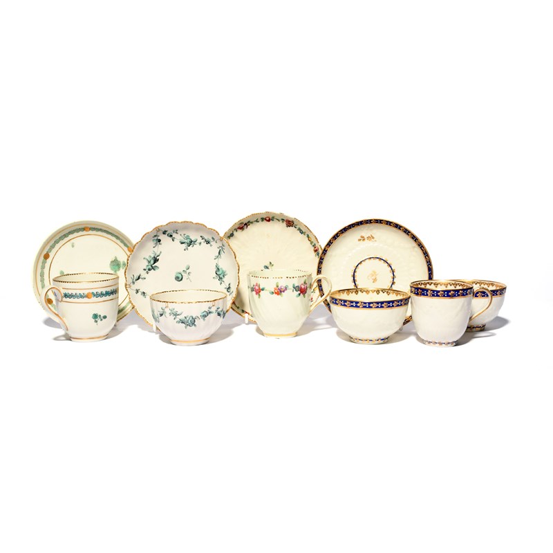 Two Chelsea Derby trios and two coffee cups and saucers, c.1770-80, one trio of fluted forms and painted with green camaieu flower swags, the other moulded with flowers and painted with a blue and gilt border, together with a matching teabowl, one cup spiral-moulded and painted with polychrome flowers, the other of plain shape and decorated with a berried band, 13cm max. (11)