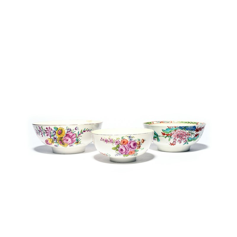 Three English porcelain punch bowls, c.1756-60, one Chelsea and painted with back-to-back roses and other flowers, red anchor mark, another Liverpool and painted with flowering peony and other plants, the interior rim with a panelled and green trellis border, the last Bow and painted with bright floral arrangements, small damages, 21.3cm max. (3)