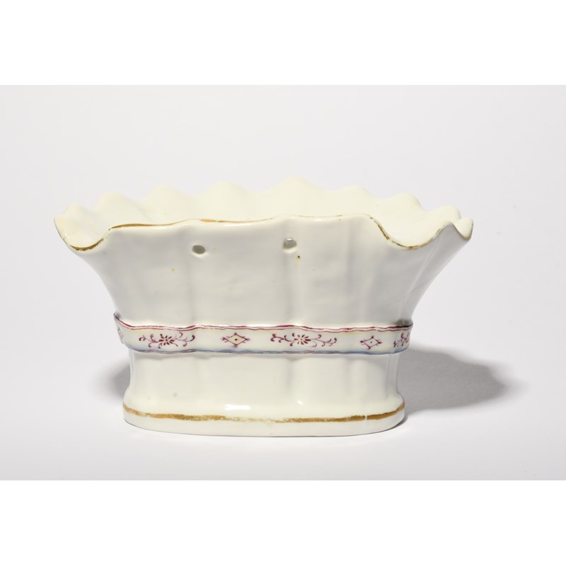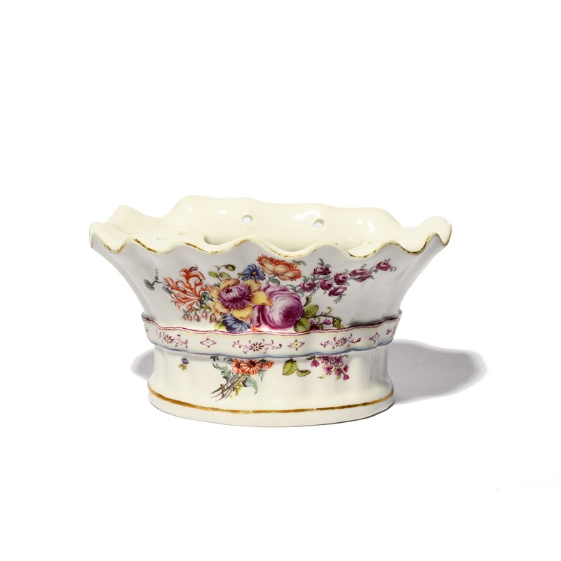 A Chelsea bough pot, c.1755, the fluted D section finely painted with a spray of flowers including honeysuckle and rose, a central moulded band with formal puce floral motifs, the top pierced with two bands of small holes around a central aperture, 18.3cm.