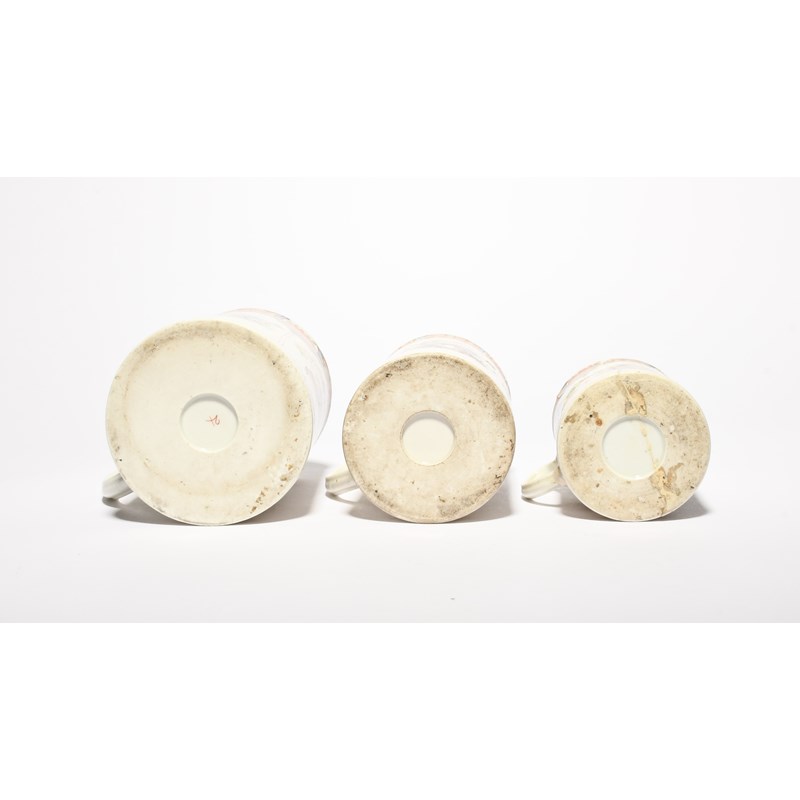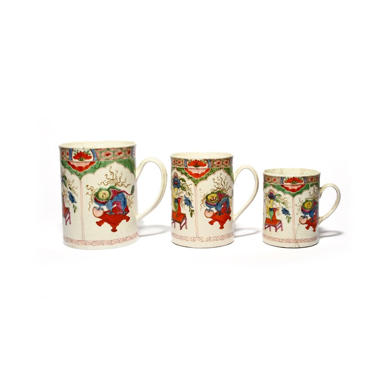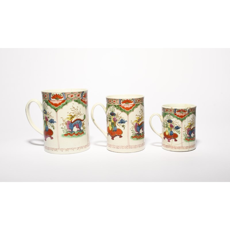 A graduated set of three Plymouth mugs, c.1770, enamelled with the Dragons in Compartments pattern, with mythical beasts alternating with panels of vases on low tables, the largest with a red tin mark, the smallest broken and restuck, a rim crack to the larger, 14cm max. (3)