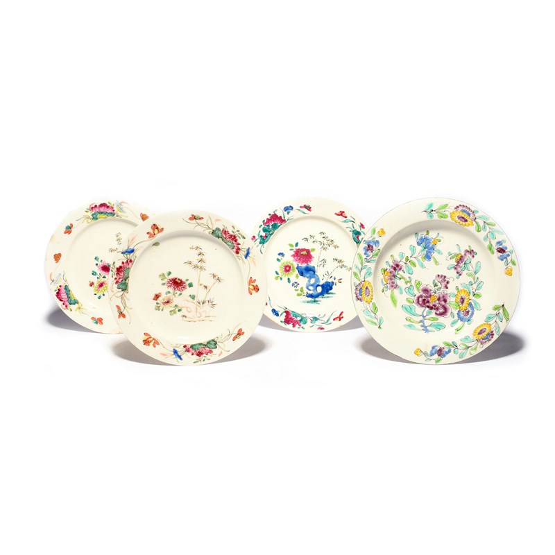 Four Bow plates, c.1754-58, three painted in famille rose enamels with bamboo and flowering chrysanthemum issuing from holey rockwork, the rims with flowering lotus and other plants, the last painted in a limited polychrome palette with peony and other flowering plants, minor damages, 23.5cm max. (4)