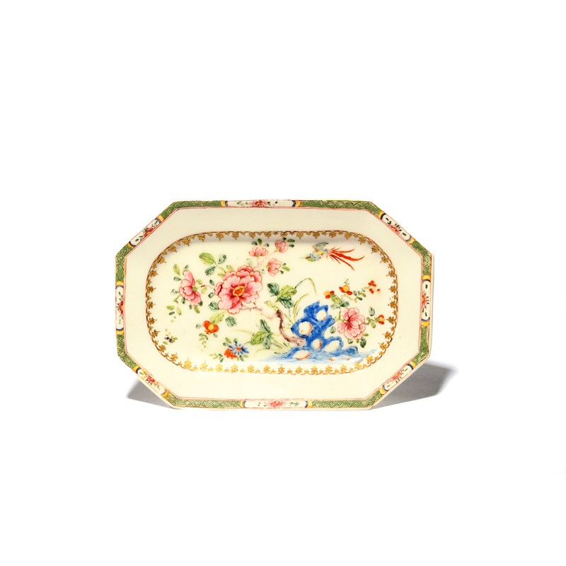 An early Bow oblong dish, c.1753, of elongated octagonal form, painted with a long-tailed bird in flight above flowering peony branches and holey blue rockwork, the cavetto with a gilt scroll border, the rim with a panelled green trellis border, 27.4cm.