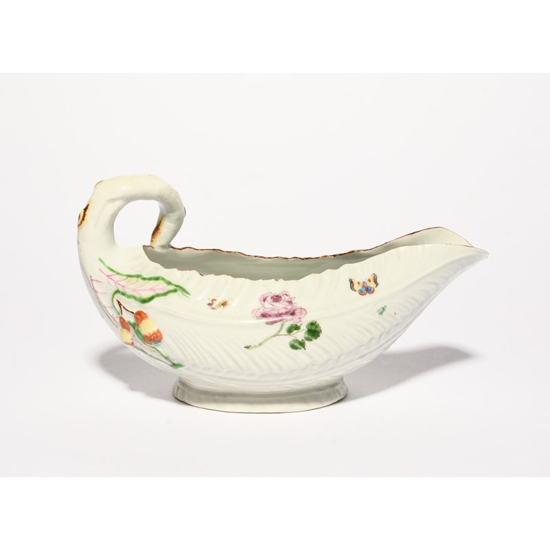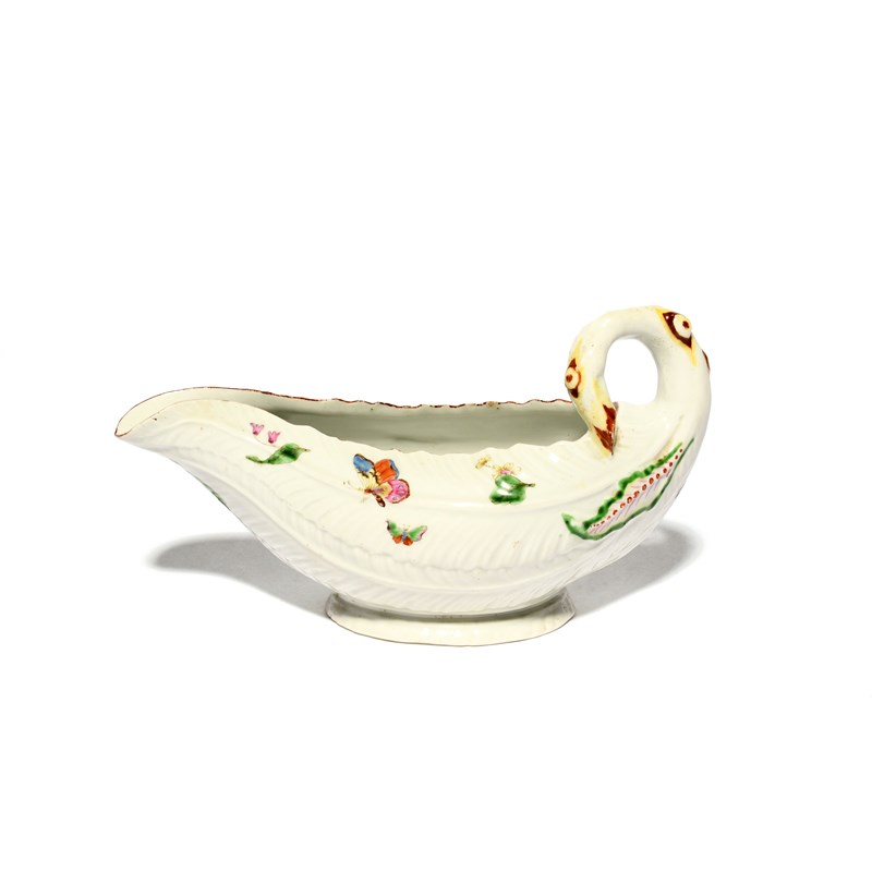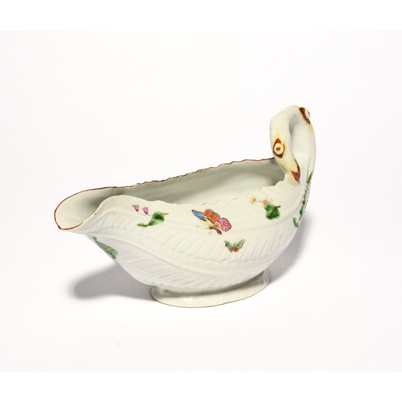 A Worcester cos lettuce sauceboat, c.1757, crisply moulded with overlapping leaves and delicately decorated with butterflies, flower sprays and scattered leaves, a further flower sprig to the interior, black painter's mark to the base, 18.2cm across.