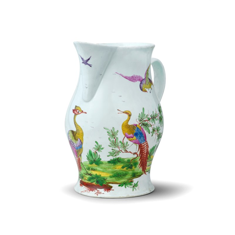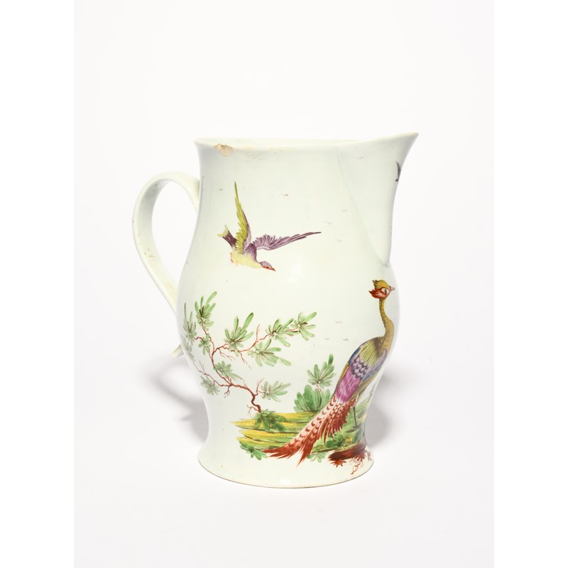 A Richard Chaffers (Liverpool) jug, c.1760-64, well painted with two long-tailed birds facing each