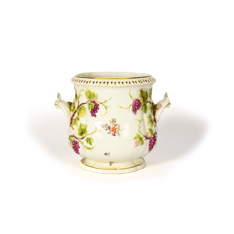 A large Chelsea wine cooler, c.1755, of lobed form, painted with small flower sprays among applied and enamelled fruiting grapevine, drilled, some peppering, 21cm high.
