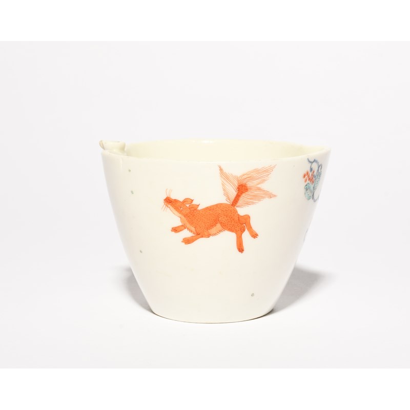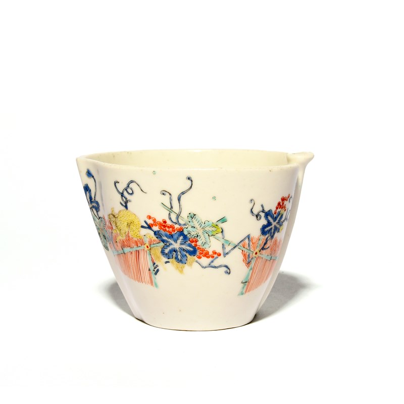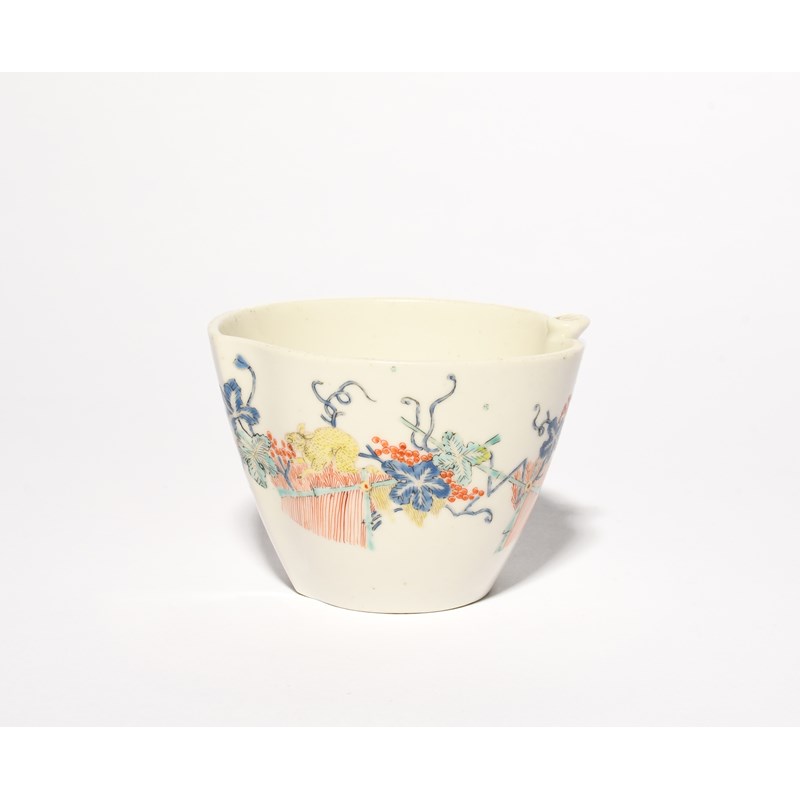 A Chelsea peach shaped jug, c.1750-52, painted in the Kakiemon palette with the Flying Fox and Squirrel pattern, the animals on and around banded hedges and fruiting grapevine, a small chip to the handle, 6.3cm high.