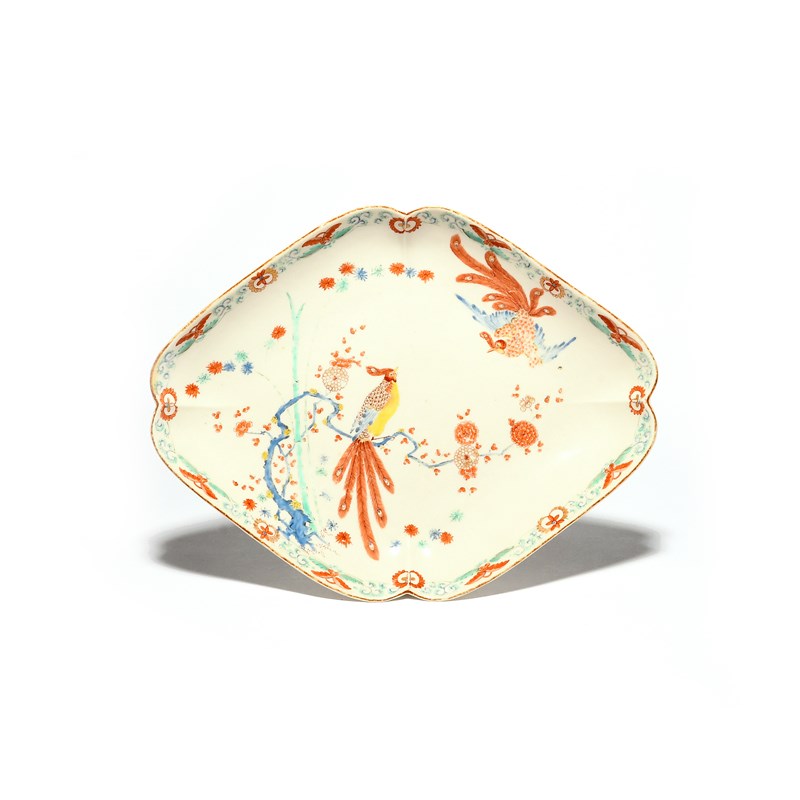 A Chelsea dish, c.1752-55, of lozenge shape, painted in the Kakiemon palette with two exotic Ho-Ho