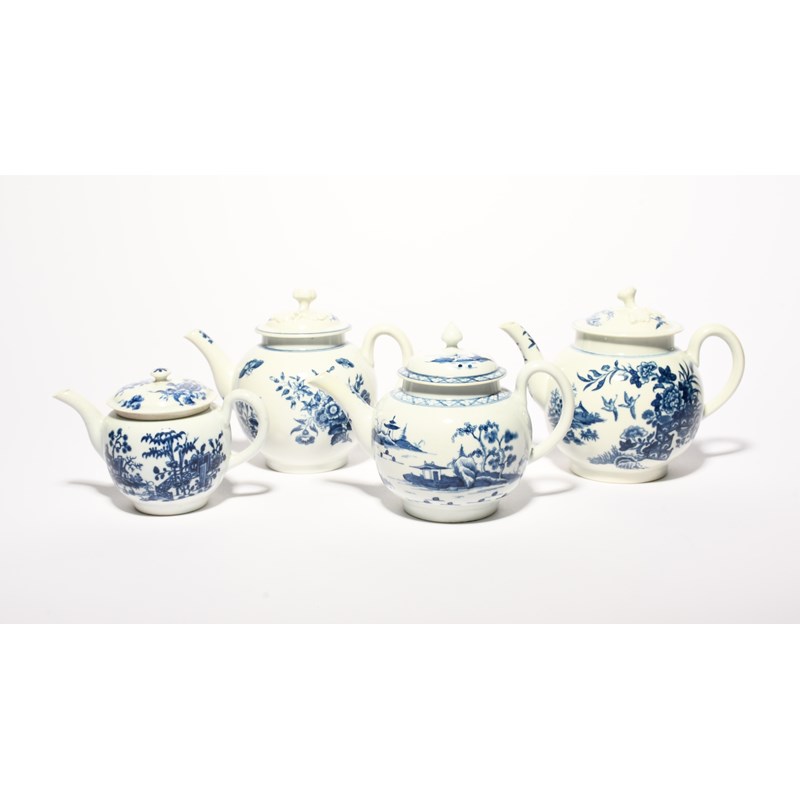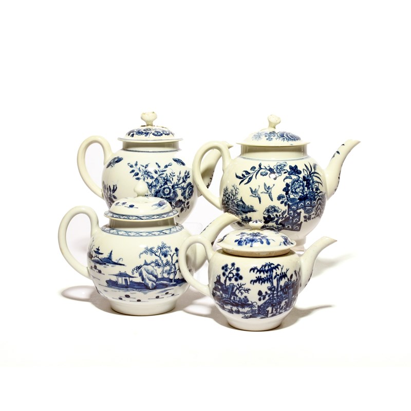 Three Worcester blue and white teapots and covers, c.1760-80, one printed with the Fence pattern, one with the Three Flowers pattern, the last painted with the Cannon Ball pattern, and a small Worcester teapot printed with the Plantation pattern, together with a matched Lowestoft cover, some faults, 18cm max. (8)