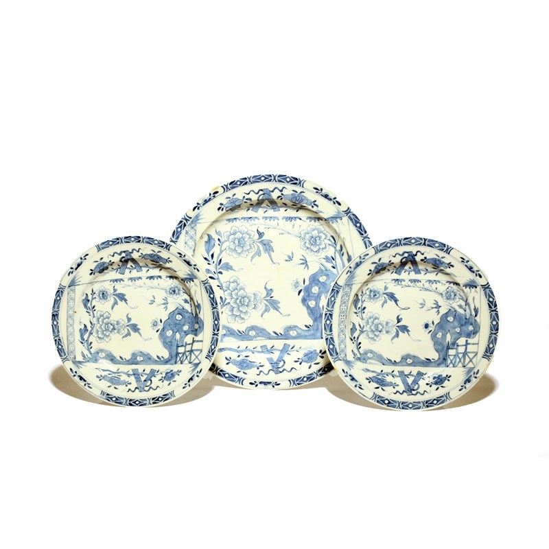 A large Bow charger or serving plate and a pair of plates, c.1750-52, all painted with the Broken Scroll pattern, the scroll depicting flowering peony and holey rockwork, within a formal panelled border, small rim chips, 30cm max. (3)